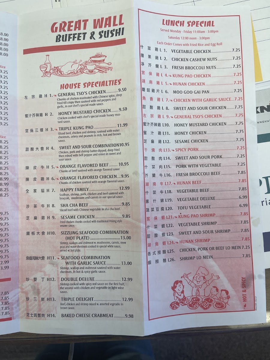 Great Wall Buffet offers a straightforward and approachable menu, perfect for those seeking a variety of familiar Chinese dishes in a relaxed buffet setting. The selection balances casual bites with comforting flavors, making it easy to find something satisfying whether you're stopping by for a quick lunch or enjoying a leisurely dinner.